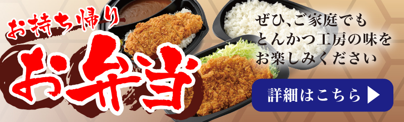 とんかつ工房では広大なカナダの大地でのびのび育ち、良質の大麦を飼料とした旨味とこくのある高タンパク・低脂肪が自慢の豚肉を使用しています。お持ち帰りメニューも豊富にご用意、電話予約も承ります。とんかつ工房の出来立ての味を店内だけでなくご家庭、オフィスでもご賞味下さい。